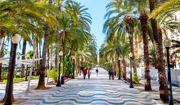 The Explanada de España, lined with palm trees and wave-pattern mosaics,